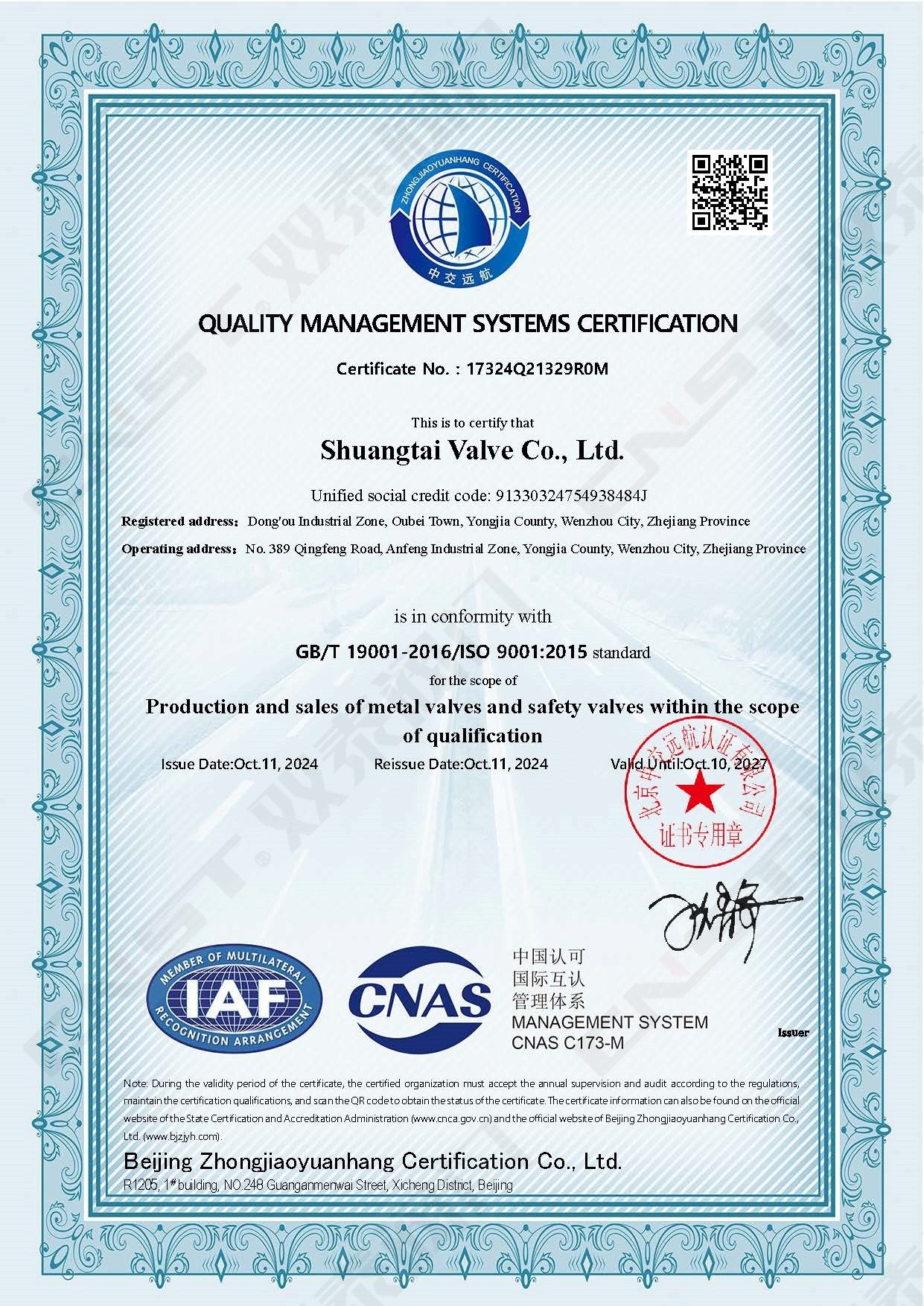 ISO9001質(zhì)量管理體系證書(shū)英文版